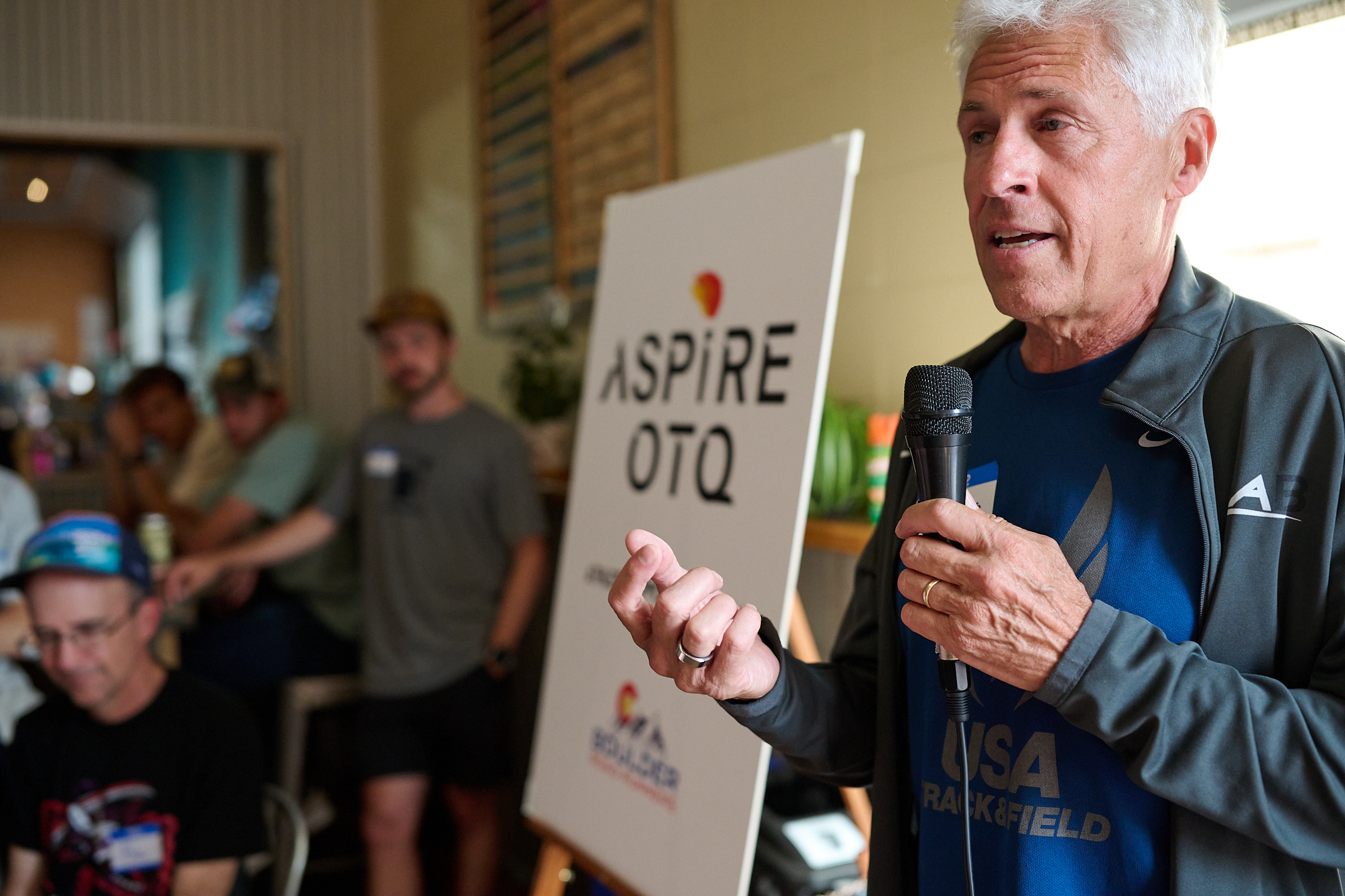 Former CU runner and Masters World Record Holder Dan King speaks at the Aspire OTQ Launch Party