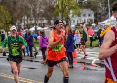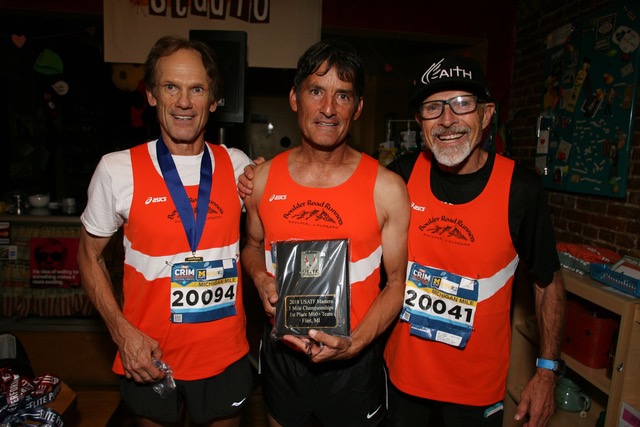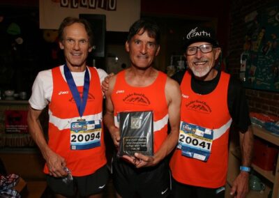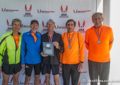 The Carlsbad 5000 in Carlsbad, California. In my first year there in 1991 I won the Master’s race. It’s like the Bolder Boulder in terms of organization and elite runners. The elites run last, so you get to watch them. It’s a fast course with a gorgeous ocean view. What’s not to like? I was returning as the defending Master’s champ my second year at Carlsbad. Now at age 41, I was actually running better than the year before. So the plan was to win again there in USATF 10K Men’s 60+ National Champions, April 2017, in Dedham, MA. The day before the race I heard that Henry Rono and Wilson Waigwa, the great Kenyan runners were also going to be racing. I had just raced Henry in the Tulsa 5K and he beat me by about 30 seconds. Wilson is my exact age and the previous year at Carlsbad, at age 40, he had run 13:56 in the elite race. My plan to win again wasn’t looking too promising. I decided to go out hard and hang with those guys as long as possible. Hopefully, they would help me run a super-fast 5K time. I hit the first mile in 4:35 and to my surprise, I was in the lead. Running like a scared rabbit I hit two miles in 9:28 and was still in the lead. I then won my second Carlsbad 5000 masters in a row. It was awesome! The newspaper write-up the next day was perfect. The author wrote that he originally didn’t think Doug Bell was even good enough to carry Henry’s and Wilson’s bags, less beat them in a race. I went home a very happy man.